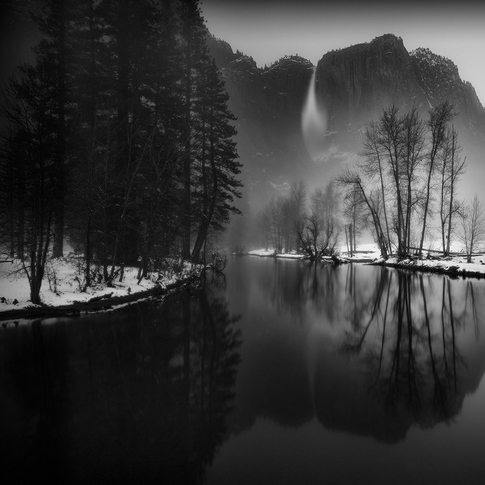Yosemite Falls from Swinging Bridge in Yosemite National Park, California at Sunset.